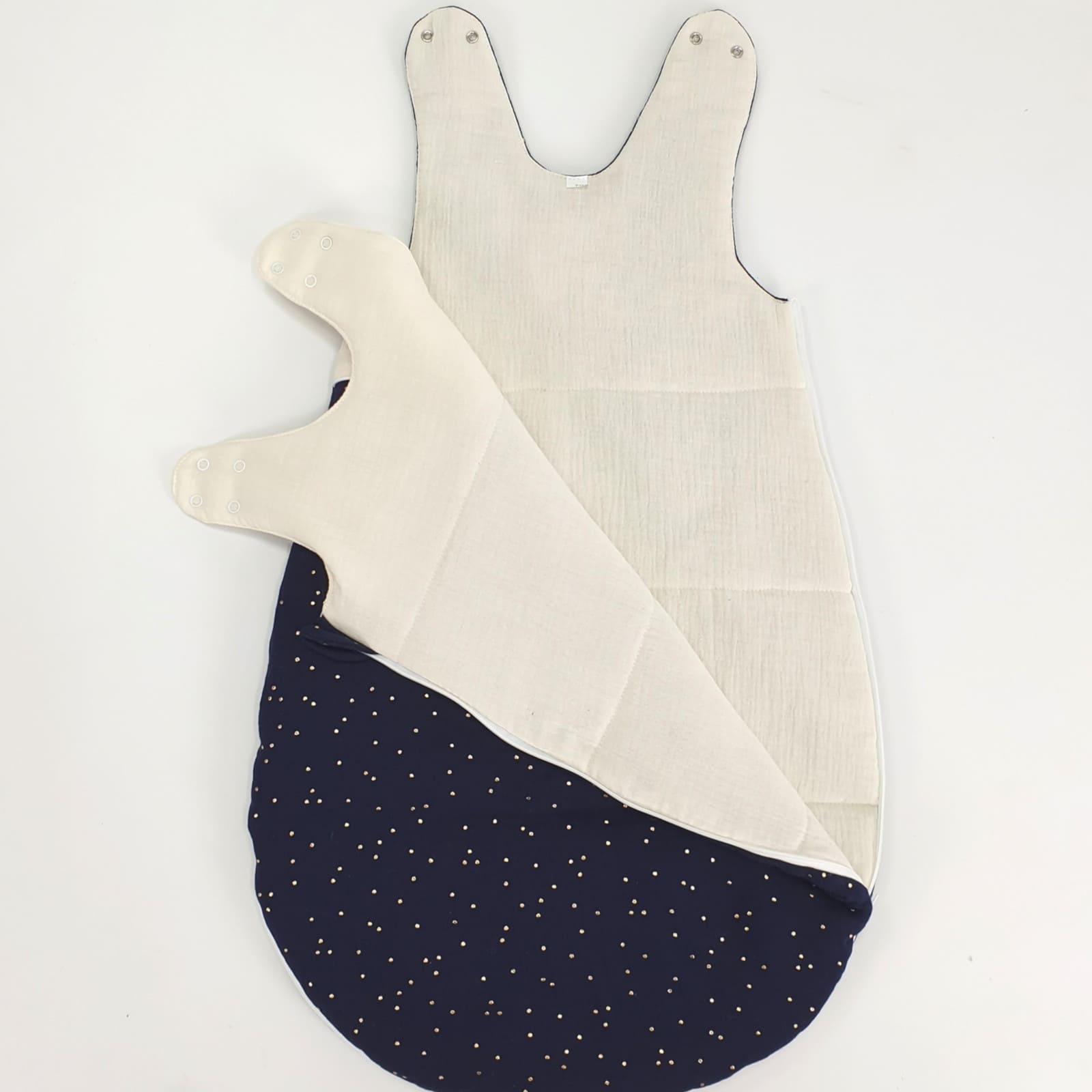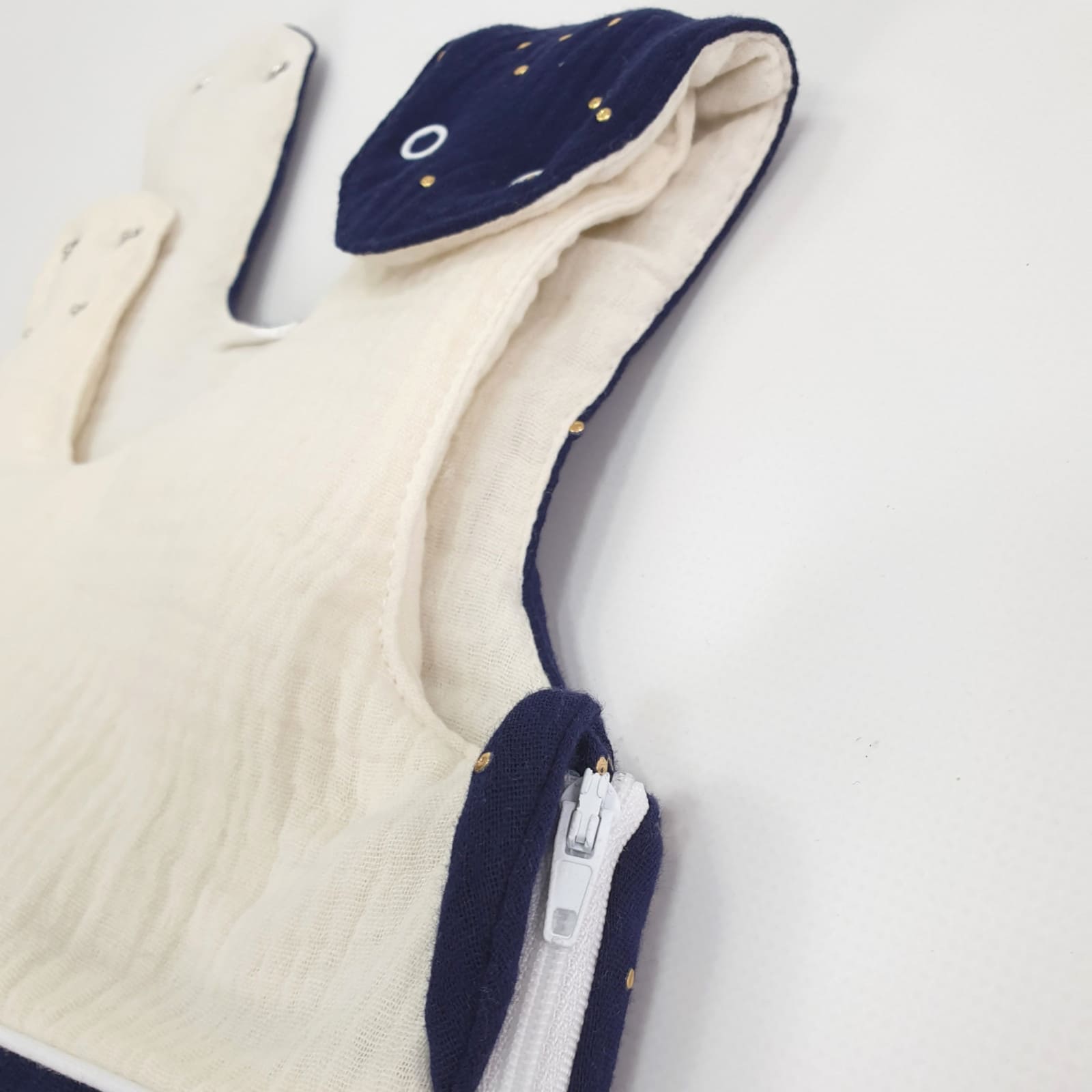 Die Nähte sind sorgfältig verarbeitet und geben dem Schlafsack Form und Haltbarkeit. Das dezente ecru-blau sorgt für eine ruhige Optik, die sich gut mit vielen Kinderzimmer-Stilen kombinieren lässt.